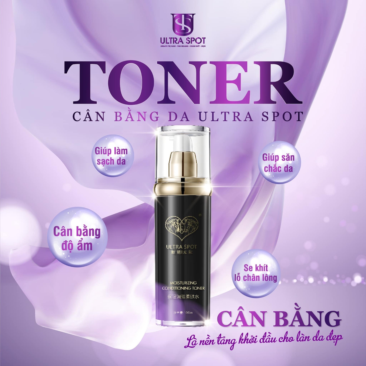 Toner giúp cân bằng và làm sạch sâu từng tế bào da, giúp da sạch khỏe và có độ PH ổn định, đồng thời giảm kích ứng da giúp da hồi phục. Công thức chứa hoạt chất giúp thu nhỏ lỗ chân lông, phục hồi hàng rào bảo vệ da và hỗ trợ hấp thụ tối đa dưỡng chất từ các bước skincare tiếp theo. Toner Cân Bằng Dưỡng Ẩm UltraSpot không chỉ làm dịu và phục hồi da tức thì mà còn duy trì độ ẩm lý tưởng. Từ đó giúp da luôn tươi tắn và rạng rỡ suốt ngày dài. Sodium Hyaluronate: Dạng muối của Hyaluronic Acid, giữ nước vượt trội, giúp da căng mịn và đàn hồi. Butylene Glycol: Thành phần này giúp dưỡng ẩm, tăng khả năng thẩm thấu của các hoạt chất khác vào da. Bước quan trọng để cân bằng làn da hiệu quả mà chị em không nên bỏ qua
